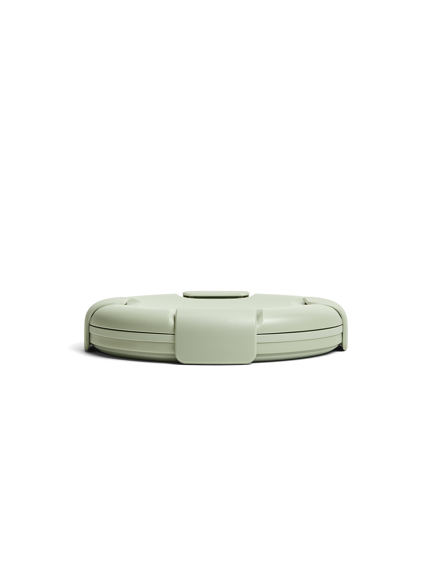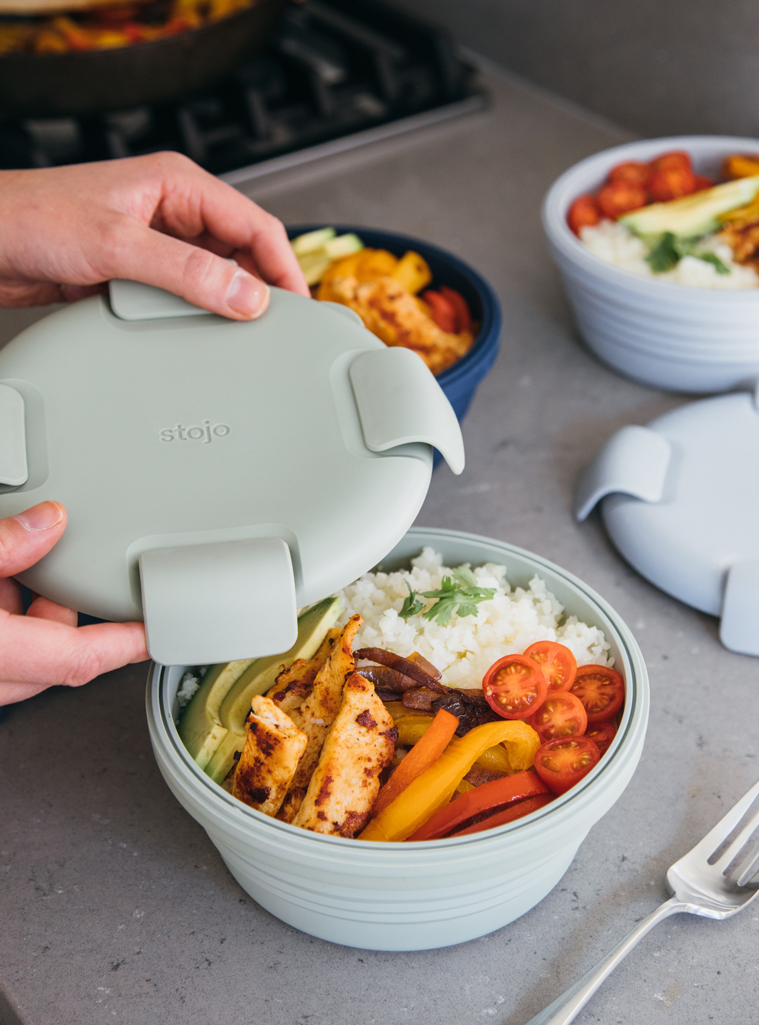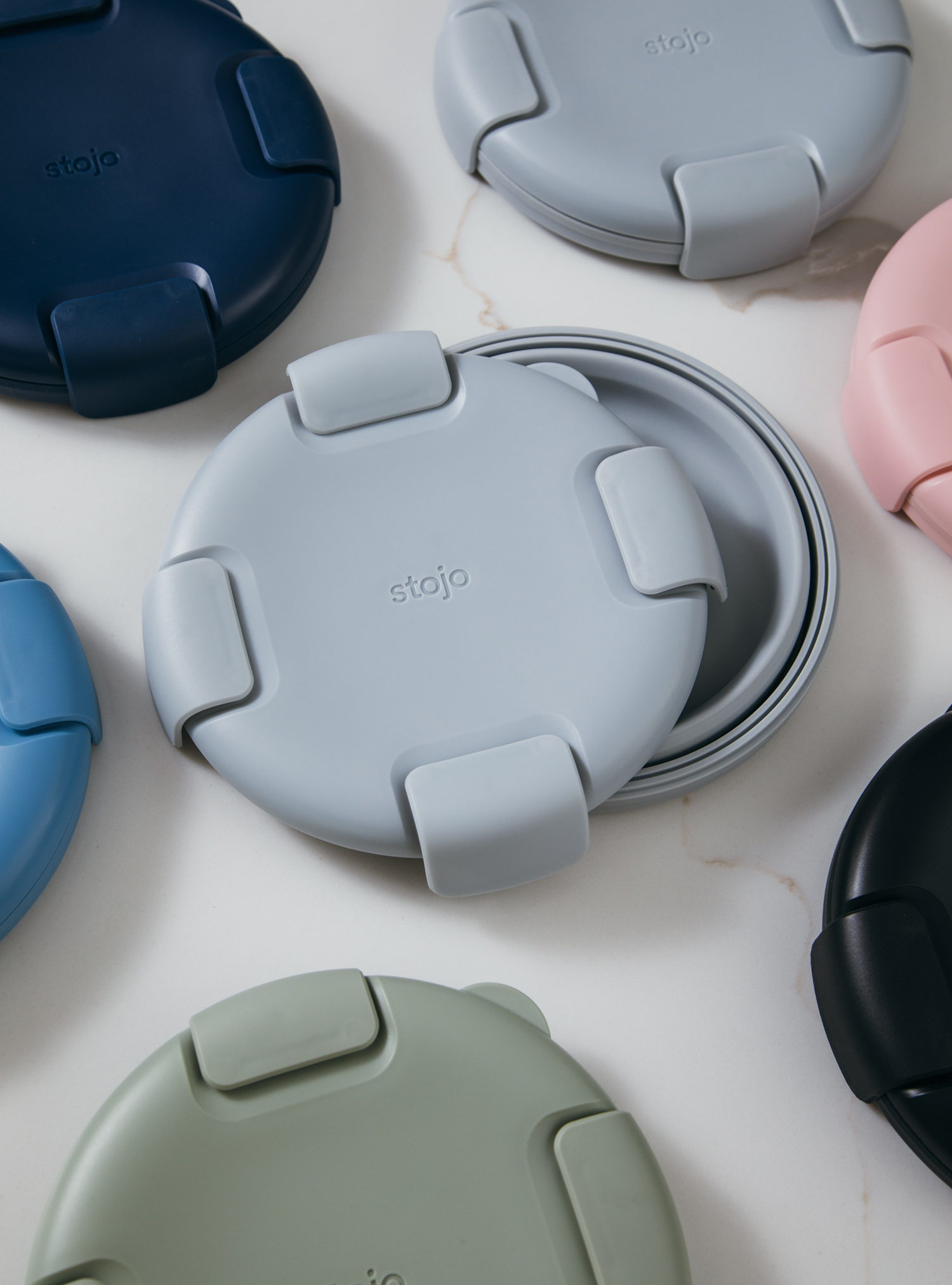 The Stojo Collapsible Bowl collapses into a flat disc for space-saving organization, complete with a lid with a leak-proof seal and clasp closure.