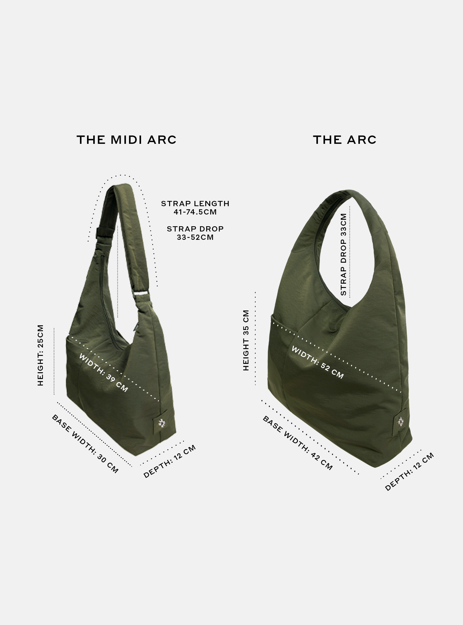 | WIDTH | HEIGHT | DEPTH | BASE WIDTH | STRAP DROP | STRAP LENGTH |